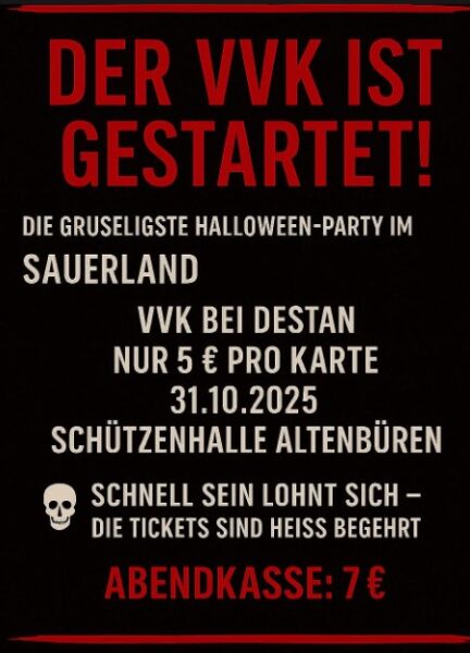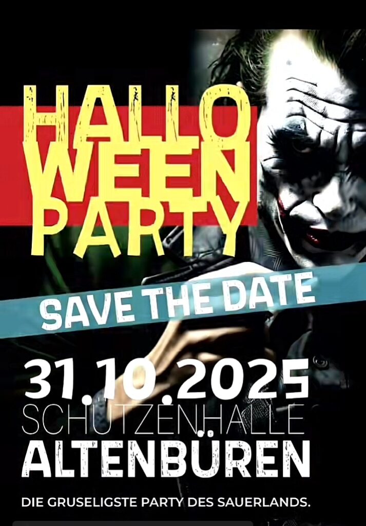 Am Freitag, 31.10.2025, startet um 19.30 Uhr in der Schützenhalle Altenbüren die langersehnte Halloween-Party. DJ Blacksmith wird dazu wieder bis tief in die Nacht für großartige Stimmung unter den zahlreich erwarteten Party-Gästen sorgen. Frühzeitiges Erscheinen lohnt sich: Gleich zu Beginn gibt es von 20 bis 21 Uhr eine Happy-Hour.