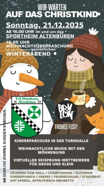 Ein weiteres Highlight der Vorweihnachtszeit steht bereits in den Startlöchern: Am 21. Dezember 2025 lädt der TuS Elmerborg Altenbüren alle herzlich zur Veranstaltung „Wir warten auf’s Christkind“ ein. Die Gäste erwartet ein vielfältiges Programm, darunter ein spannender Kinderparcours in der Turnhalle, weihnachtliche Musik mit den Möhnequins und ein virtueller Skisprung-Wettbewerb für Groß und Klein. Diese Veranstaltung verspricht ein weiteres unvergessliches Erlebnis für die ganze Familie zu werden. Seien Sie dabei und genießen Sie die festliche Stimmung!