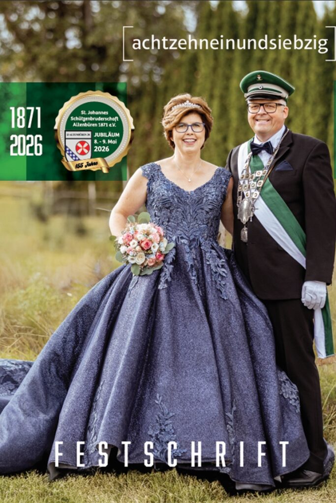 155 Jahre St. Johannes Schützenbruderschaft Altenbüren. Dieses Ereignis soll nicht nur am 8. + 9. Mai gebührend gefeiert werden – auch wollen wir die letzten 30 Jahre St. Johannes Revue passieren lassen. In einer einzigartigen Festschrift haben 28 Königspaare, angefangen von Manni Göke & Sylvia Bange bis hin zum amtierenden Königspaar Markus & Evelyn Krollmann sowie natürlich auch dem noch amtierenden Kaiserpaar Uwe & Beate Stappert eindrucksvolle Berichte zu ihrer Regentschaft veröffentlicht. Von lange geplanten Königsschüssen bis zu Schützenkönigen, die am Freitagmorgen an wirklich alles dachten, außer noch am selben Abend im Mittelpunkt des Geschehens zu sein, hat es beim Altenbürener Schützenfest in den vergangenen Jahren alles gegeben. Aber eines haben alle gemeinsam: Alle sind sich einig, „es gibt nichts schöneres auf Erden, als einmal in Altenbüren Schützenkönigspaar zu werden!“