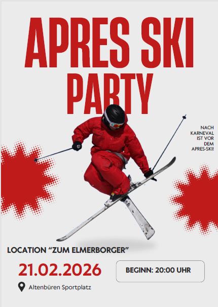 der TuS Elmerborg Altenbüren öffnet am Samstag, den 21. Februar 2026, ab 20:00 Uhr seine Pforten und lädt alle groß und klein zur Premiere der 1. Elmerborger Apres-Ski-Party ins Sportheim „Zum Elmberborger“ ein.