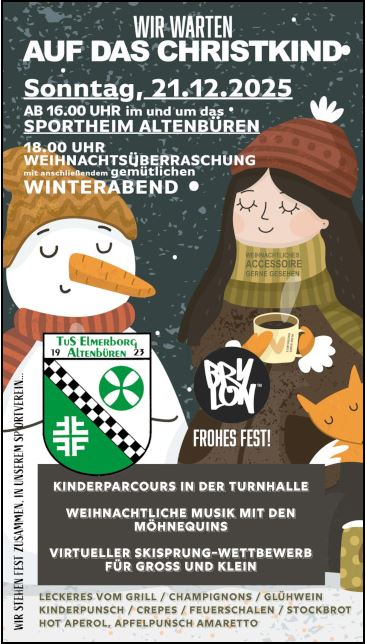 es ist wieder soweit: Am Sonntag, den 21. Dezember 2025, ab 16:00 Uhr verwandelt sich unser Sportheim „Zum Elmerborger“ und die Umgebung in einen Ort voller Vorfreude, Wärme und Gemeinschaft.